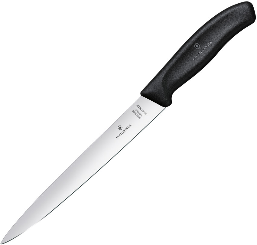 13" (33.02cm) overall. 8" (20.32cm) satin finish stainless blade. Black TPE handle. Dishwasher safe.